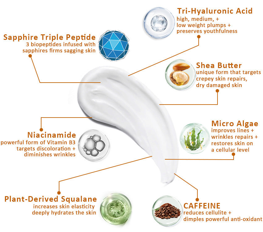 - Sapphire Infused Triple Peptide: Okrzyknięty szczytem technologii peptydowej, kompleks ten wnika głębiej w leżące poniżej warstwy skóry, przyspieszając rezultaty i skutecznie przeciwdziałając zmarszczkom i zwiotczeniu skóry.